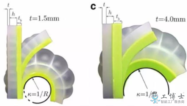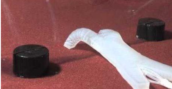 比如將三根直徑為0.79mm、長度相同的管子接在機器人上,再接通一根直徑為0.38mm的長管輸送氣流。它其中的一條“腿”就能充滿空氣并彎曲起來,而另外三根上接通的管道由于直徑更粗并且長度相同,因此輸送壓縮空氣的時間較短,其余三端可幾乎同時鼓起落下。