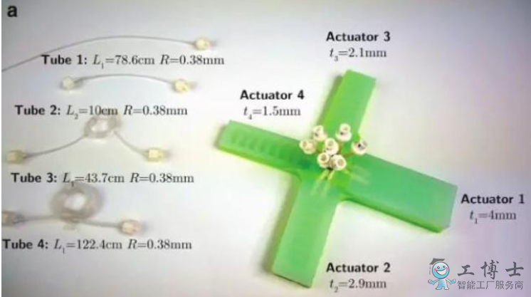 該方法通過使用不同直徑的管子來控制空氣在軟體機器人裝置中的移動速度,即一次性通過其中一個管泵輸送相同數量的空氣,管的大小將決定空氣流動的方式和位置。