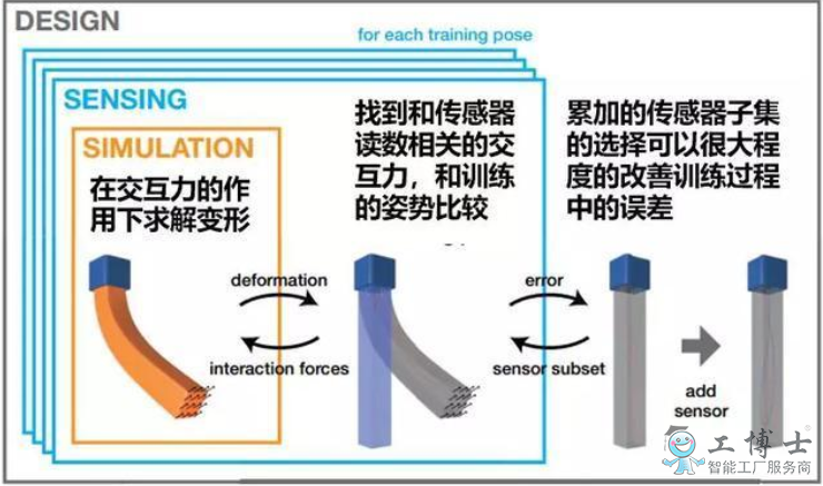首先是要在計算機中設計出軟體機器人彈性體的幾何模型,然后利用這個模型進行一系列的不同形態的模擬交互訓練。接下來研究者根據交互訓練中彈性體的應變場分布(應變場分布有模擬交互得到)來生成一大組可以選擇的合理的傳感器路徑,這些傳感器路徑對于外界的輸入都非常敏感(研究者發現,在最開始集成200個候選傳感器足以在各個不同的方向表示物體)。接著通過連續迭代優化算法來選出最優的一組傳感器分布的方式,從而大量的減少傳感器的數量。最終根據得到的傳感器路徑來制造樣機進行測試。