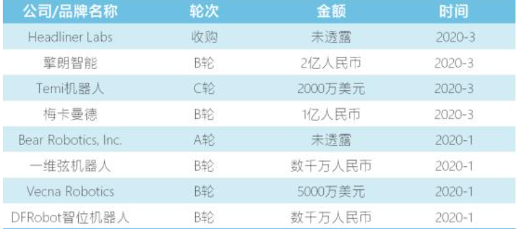 到了2020年,從一月到三月,機器人行業的融資事件共有8起。3月,擎朗機器人獲得2億人民幣,梅卡曼德獲得1億人民幣。