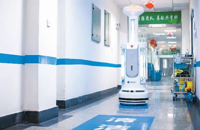在四川德陽市人民醫院拍攝的工作中的鈦米消毒機器人。新華社發