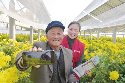 當前,正是菊花盛開采收的季節,安徽省宿州市碭山縣玄廟鎮吳寨村的菊花種植基地里,百余畝菊花迎風綻放。為助力農戶采摘,安徽移動碭山分公司組建黨員服務小分隊,深入菊花種植基地、田間地頭和村莊,現場指導農戶通過5G終端發布觀菊、賞菊、攝菊信息,讓農民足不出村將秋菊銷往各地。圖為移動志愿者指導吳寨村村民錄制宣傳視頻。
