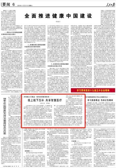 11月27日,人民日報在第6版刊發題為《濟南建立全覆蓋一體化醫保服務體系——線上線下互補 共享智慧醫療》的文章,點贊了濟南醫院開設線上線下結合的慢病管理專區,將慢病患者的就醫問診、慢病續方、復診復查、藥品配送等全部集中到一個窗口,實現醫院電子處方向慢病藥房的流轉,解決群眾多窗口辦理、排隊等問題。