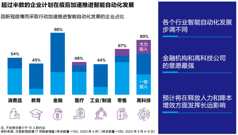 今年4月,貝恩針對IT采購者的一項(xiàng)調(diào)研也表明,新冠疫情促進(jìn)了各個行業(yè)全價值鏈的智能化:超過一半受訪企業(yè)表示,在疫情影響下,正在計(jì)劃加速推進(jìn)智能自動化發(fā)展。從行業(yè)來看,金融機(jī)構(gòu)和高科技公司的意愿強(qiáng)烈,分別有90%和80%的受訪企業(yè)表示愿意在智能自動化改革方面進(jìn)行長期、持續(xù)的投入。此外,為了滿足不斷增長的消費(fèi)者需求,醫(yī)療、消費(fèi)品和零售行業(yè)亦積極布局,在日常運(yùn)營和管理中納入智能自動化工具,以應(yīng)對疫后“新常態(tài)”。
