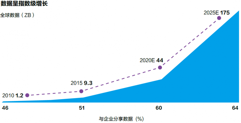 貝恩研究顯示,過去十年,全球數(shù)據(jù)量呈現(xiàn)指數(shù)級增長,從1.2ZB增長到44ZB。未來5年,全球數(shù)據(jù)將繼續(xù)保持高速增長,預(yù)計(jì)將從44ZB增長到175ZB。