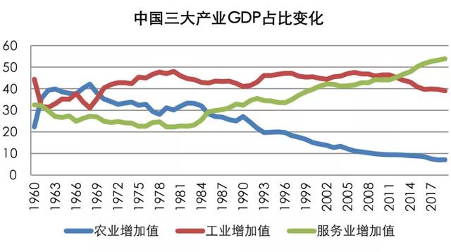 下圖是中國三大產業在GDP中占比的變化。