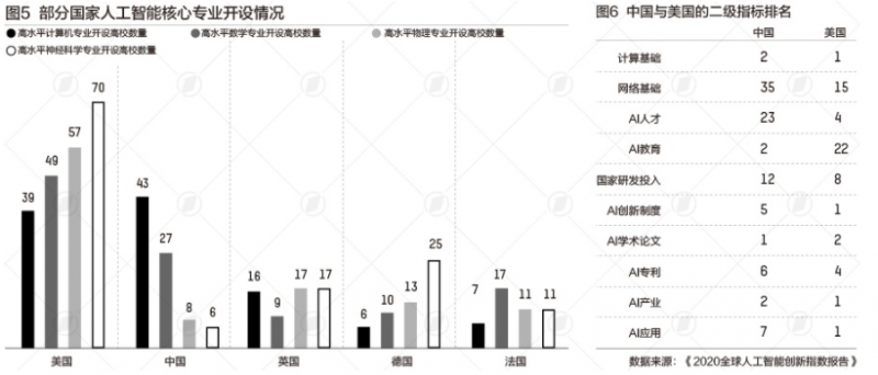 報告顯示,中國的人工智能創新指數綜合得分從2019年的第三名上升至2020年的第二名。從具體指標看,中國在基礎支撐、創新資源與環境、科技研發、產業與應用等方面均表現良好,四個一級指標均排名前十。