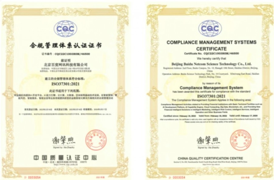 近日,百度智能云通過中國(guó)質(zhì)量認(rèn)證中心(CQC)的權(quán)威審核,取得行業(yè)首家ISO37301合規(guī)管理體系認(rèn)證證書。