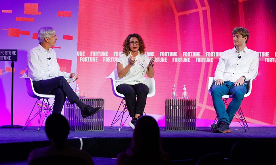 2022年《財(cái)富》科技頭腦風(fēng)暴大會(huì)上,人工智能公司DeepMind的首席運(yùn)營(yíng)官萊拉·易卜拉欣(中)、搜索引擎you.com的首席執(zhí)行官理查德·索赫爾(右)與《財(cái)富》雜志的維恩·科皮托夫就人工智能的進(jìn)展進(jìn)行對(duì)話。(圖片來(lái)源:MICHAEL FAAS—FORTUNE)