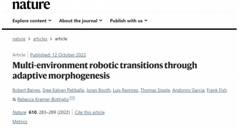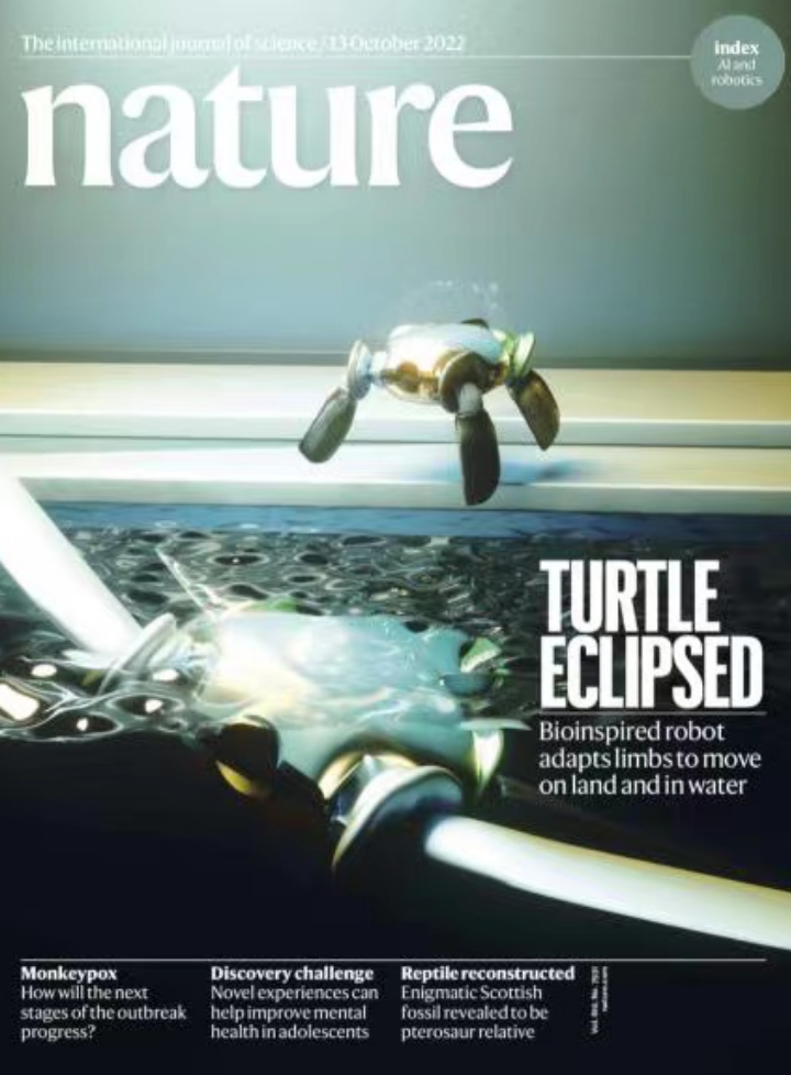 近日,耶魯大學(xué)Rebecca Kramer-Bottiglio教授課題組從陸生和水生烏龜身上得到的靈感,運(yùn)用了"適應(yīng)性形態(tài)發(fā)生"的設(shè)計(jì)策略,建造了一個(gè)機(jī)器人,它融合了傳統(tǒng)的剛性部件和軟性材料,從根本上增強(qiáng)了其四肢的形狀,并為多環(huán)境的運(yùn)動(dòng)改變了其步態(tài)。步態(tài)、肢體形狀和環(huán)境介質(zhì)的相互作用證實(shí)了控制機(jī)器人運(yùn)輸成本的重要參數(shù)。結(jié)果證明,自適應(yīng)形態(tài)發(fā)生是提高移動(dòng)機(jī)器人遇到非結(jié)構(gòu)化、不斷變化的環(huán)境的效率的有力方法。相關(guān)成果以“Multi-environment robotic transitions through adaptive morphogenesis”為題發(fā)表在最新一期Nature上,并作為Nature封面。