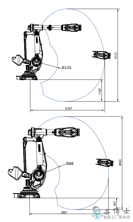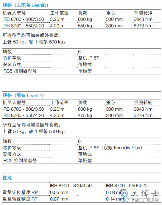 IRB 8700 提供兩種型號:一種工作范圍為 4.2 m,有效負載 550 kg(手腕垂直向下時為 620 kg,配套 LeanID 時為 475 kg);另一種工作范圍為 3.5 m,有效負載 800 kg(手腕垂直向下時為 1000 kg,配套 LeanID 時為 630 kg)。兩種型號的轉動慣量均高達725 kgm2。