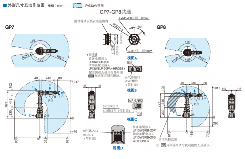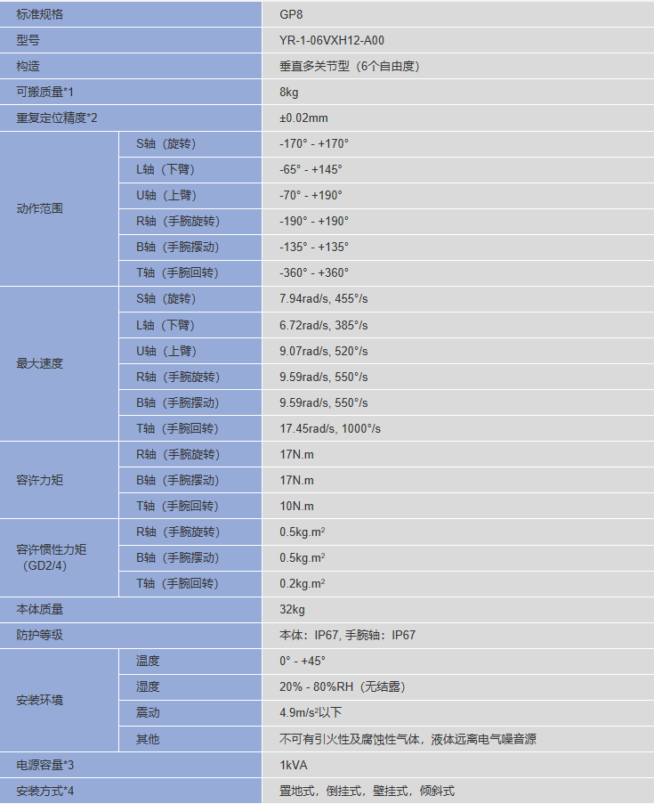 *1:U臂上的負(fù)載隨手腕部負(fù)載重量變化。 *2:JIS B 8432為基準(zhǔn)。 *3:因用途,動(dòng)作模式而異。 *4:壁掛式,傾斜式安裝時(shí),S軸的動(dòng)作會(huì)有限制。(注)本表是以SI單位系為記載。
