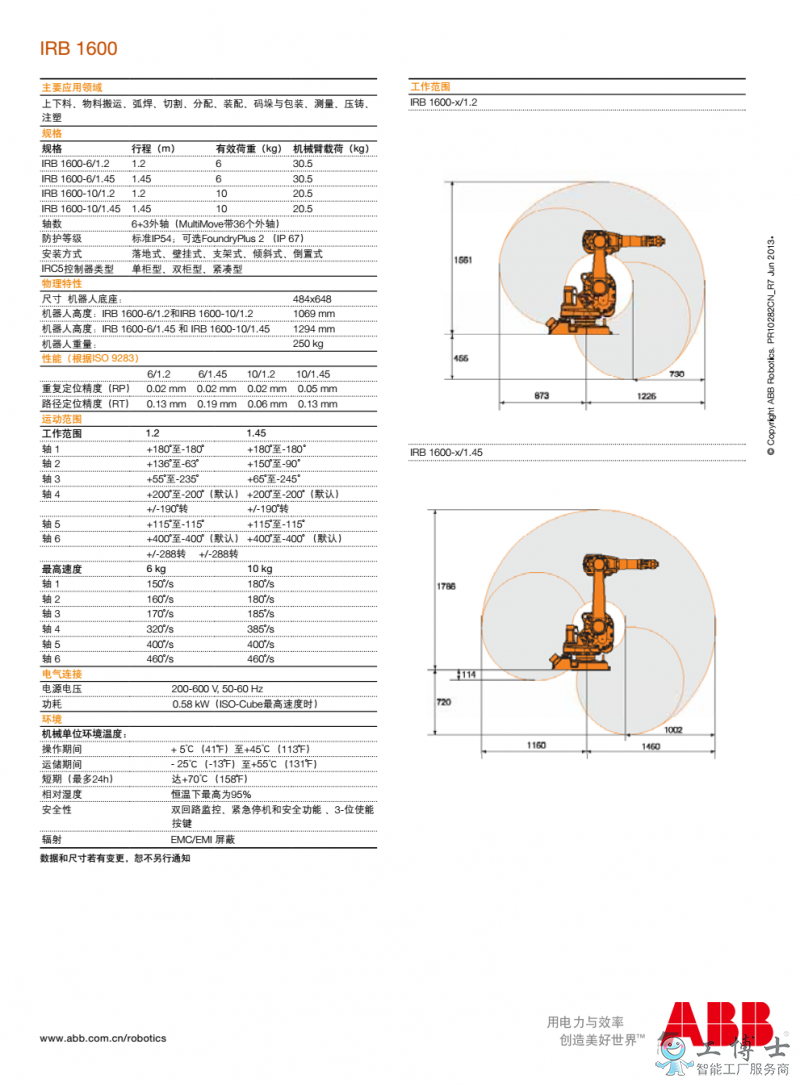 產品詳情:ABB機器人IRB IRB 1600-10/1.45【負載: 10kg 工作區域: 1450mm】