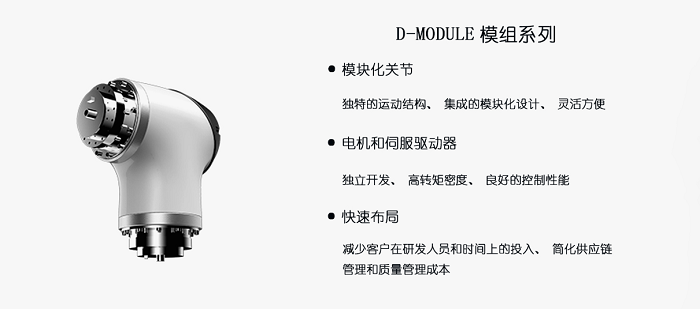 Product Category: D-Modules模組系列大族機(jī)器人專門為協(xié)作機(jī)器人設(shè)計了一款雙關(guān)節(jié)模組,高度集成了無框直驅(qū)力矩電機(jī)、