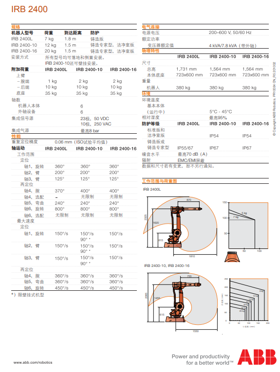 IRB 2400強勁有力,性能優異。第1軸和上臂附加荷重分