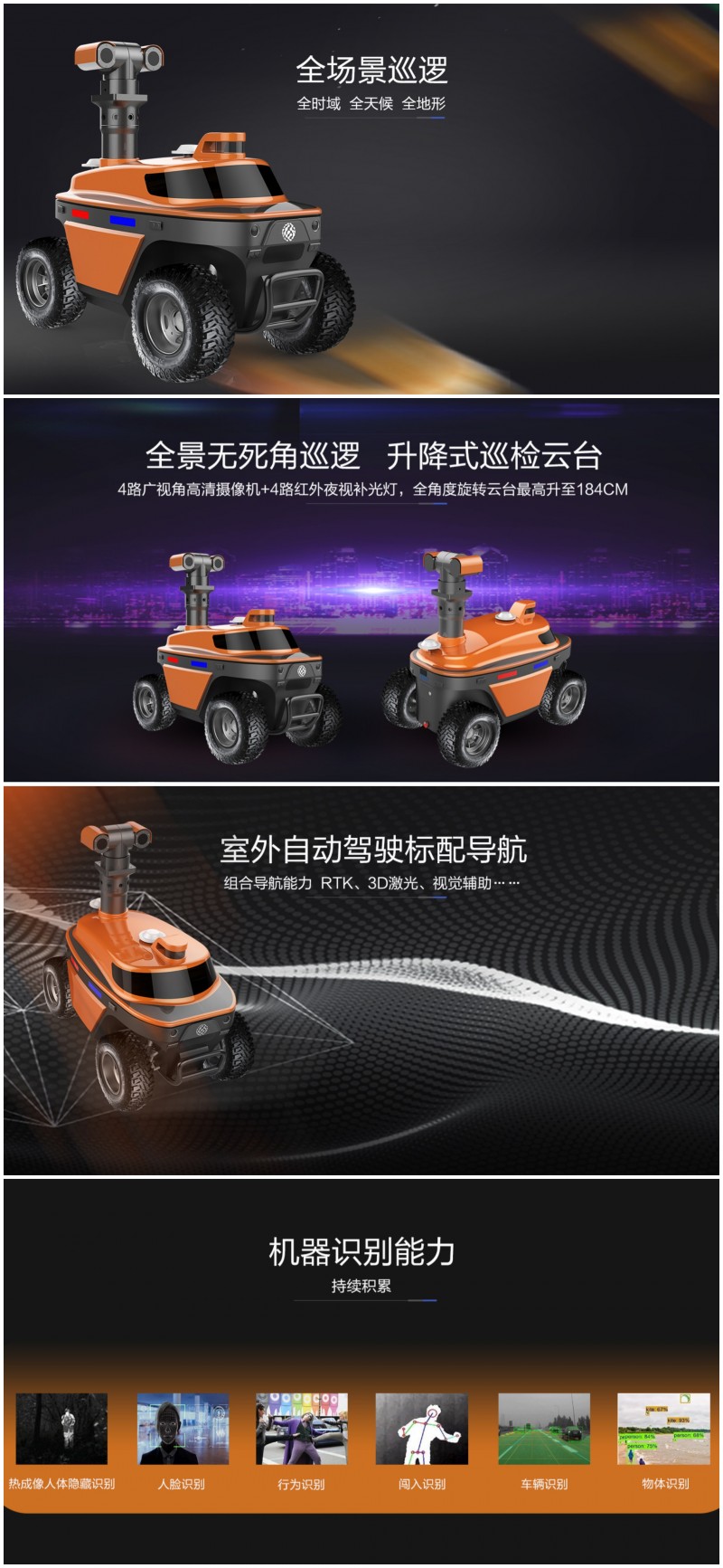 千巡O2安防機(jī)器人:業(yè)內(nèi)***高巡航速度10公里/小時(shí);4路廣視角高清攝像機(jī)+4路紅外夜視補(bǔ)光燈,全角度旋轉(zhuǎn)云臺(tái)***高升至184cm。